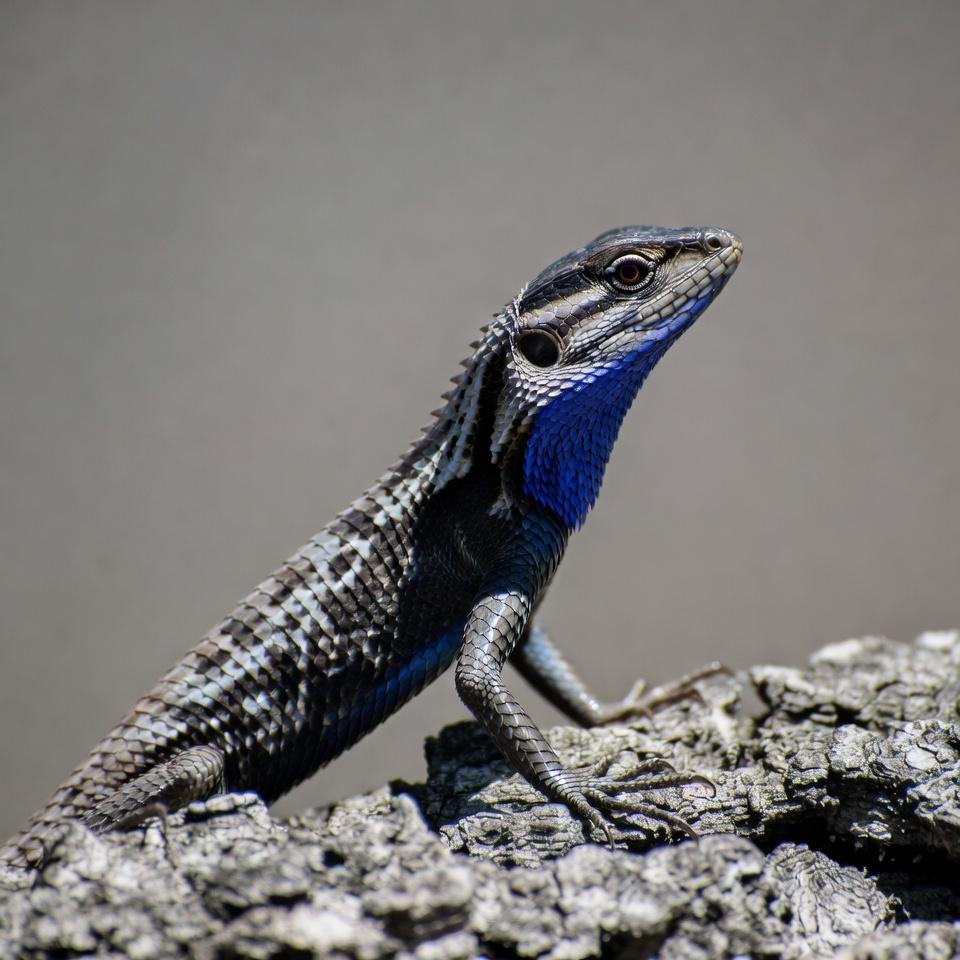 animal, black lizard, blue lizard, blue throat, closeup, herpetology, iguana-like, isolated background, nature, reptile, rock, scales, striped lizard, wildlife, lizard