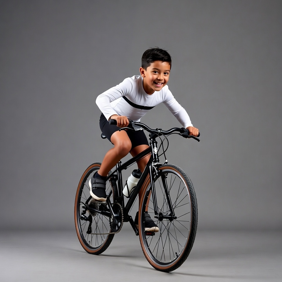 A young boy with short dark hair smiles happily while riding a small black bicycle. He wears a white long-sleeve top with black stripes, black shorts, and black sneakers. The bike has a water bottle attached and is positioned against a plain gray background.
