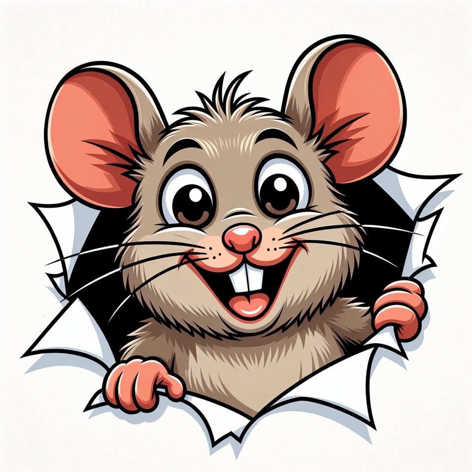 A cute cartoon mouse with big eyes and a wide smile peeks through a jagged tear in white paper. The mouse has brown fur, pink ears, and paws gripping the edges of the rip. It appears playful and animated on an isolated white background.