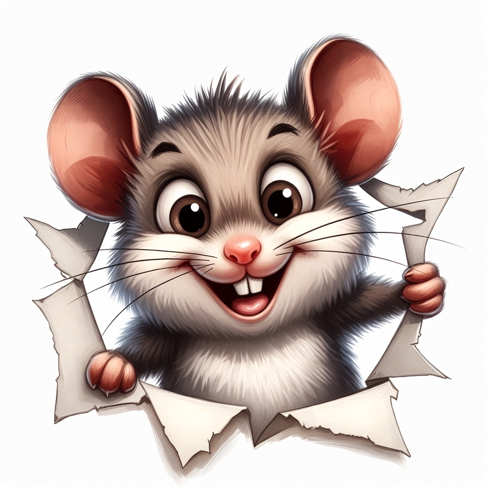adorable rodent, animal illustration, big eyes, cartoon mouse, clipart mouse, digital art, fluffy mouse, fun mouse, gray fur, happy mouse, isolated background, kawaii mouse, mouse illustration, paper tear, peeking mouse, pink ears, ripped paper, smiling mouse, torn paper, cute mouse