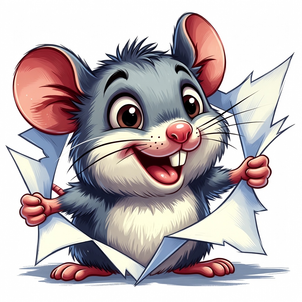 A cute gray cartoon mouse with large expressive eyes and pink ears happily tears through a white paper sheet with its paws. The mouse has a big smile showing tiny teeth and stands on a plain background. The illustration features fluffy fur and vibrant colors.