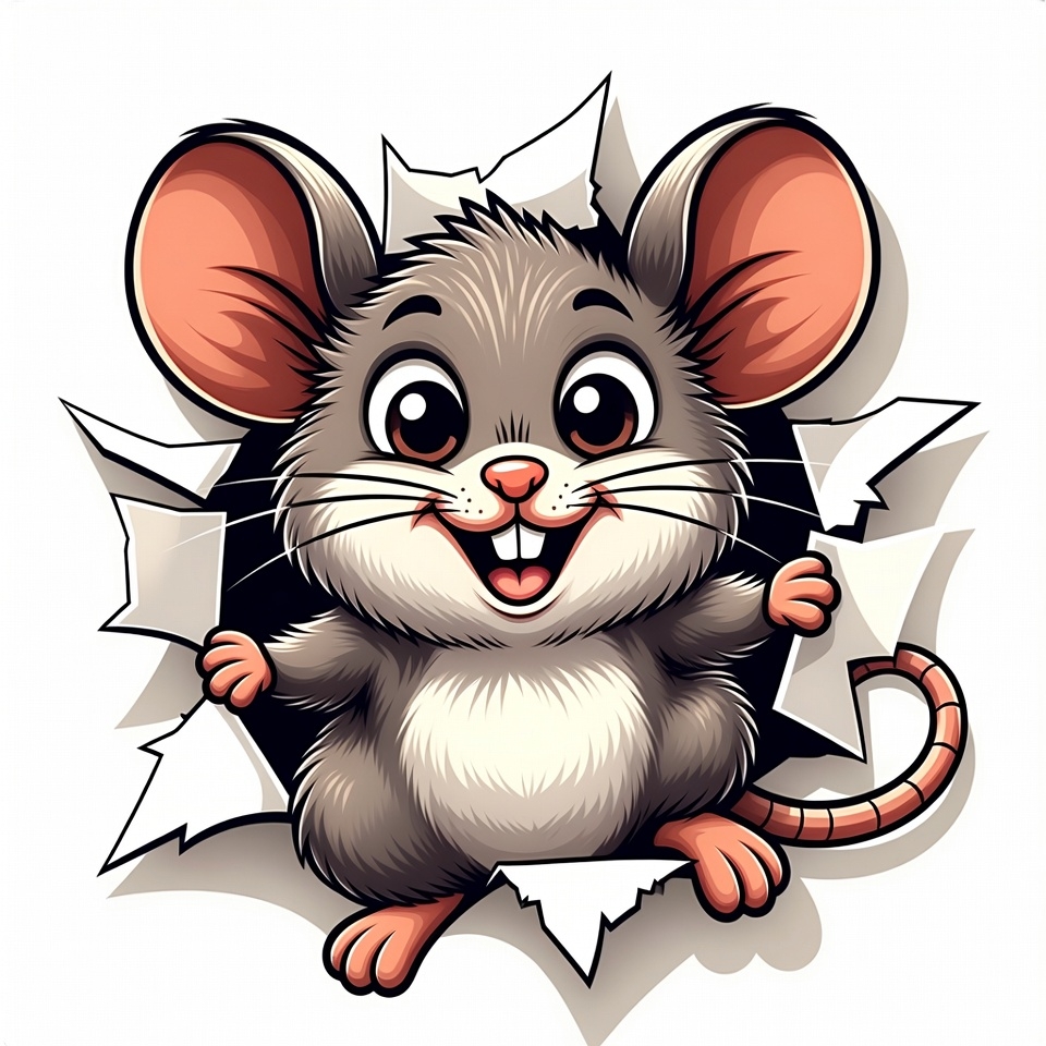 A cartoon mouse with big sparkling eyes and a wide smile bursts through torn white paper. The mouse has gray fur, pink ears, and outstretched paws. It stands on a white isolated background in a vibrant illustration style.
