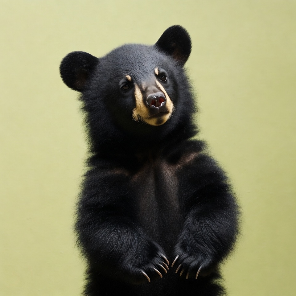 adorable animal, baby bear, bear cub, bear portrait, black fur, brown eyes, cute bear, fluffy fur, green background, isolated background, large ears, mammal, paws, standing bear, wild animal, wildlife, young bear, black bear