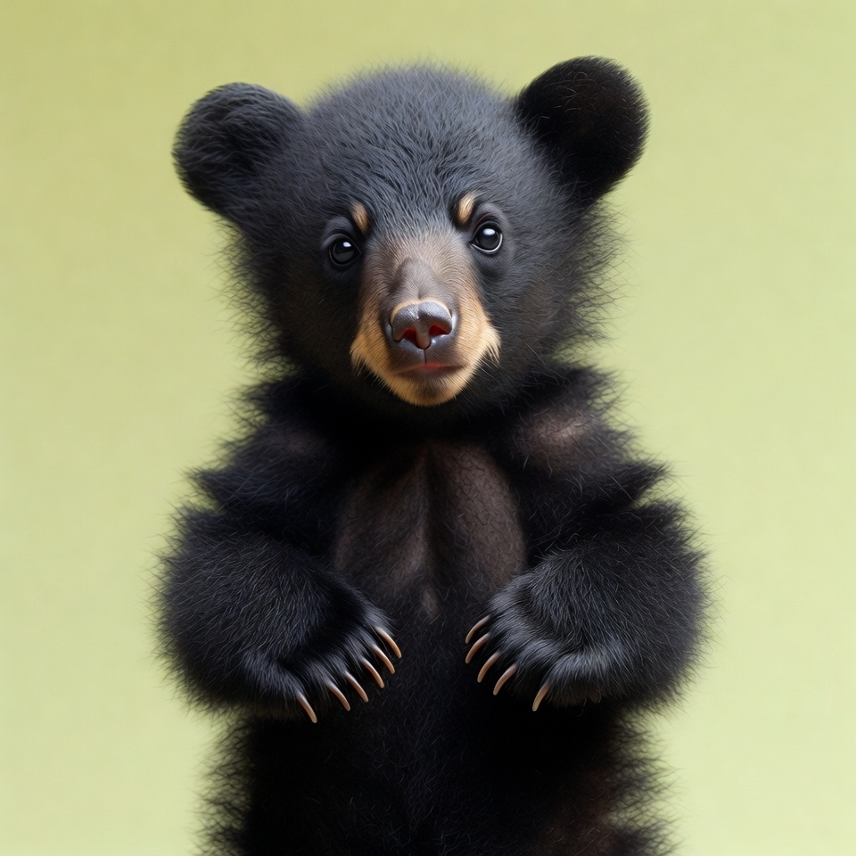 A fluffy black bear cub stands on its hind legs against a solid green background. The cub has large dark eyes, shiny black fur, and raised paws. Its expressive face features a small pink nose and tan muzzle.