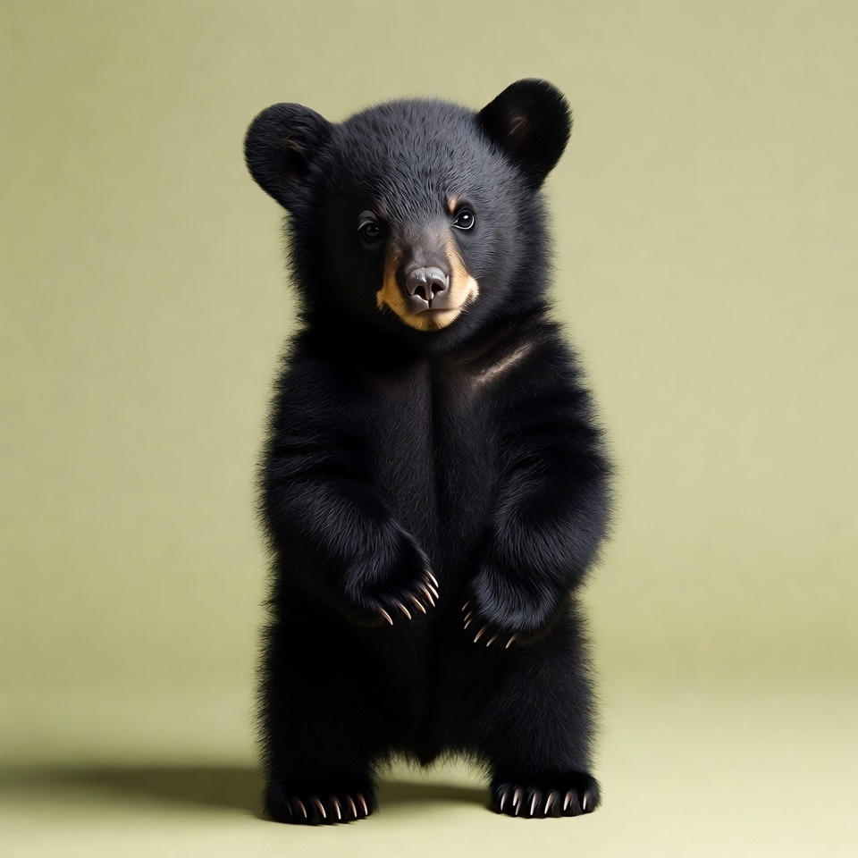 A fluffy black bear cub stands on its hind legs against a solid green background. The cub has shiny black fur, large round ears, and a curious expression with dark eyes and a small snout. Its paws are raised slightly in front as it faces forward.