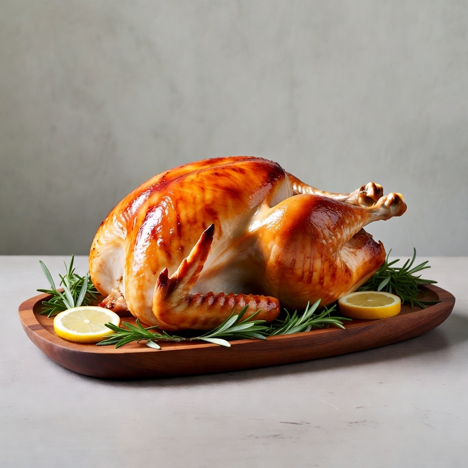 A whole roasted turkey with glossy golden-brown skin is presented on a wooden board. It is garnished with fresh rosemary sprigs and lemon slices around the base. The turkey rests on a neutral gray background.
