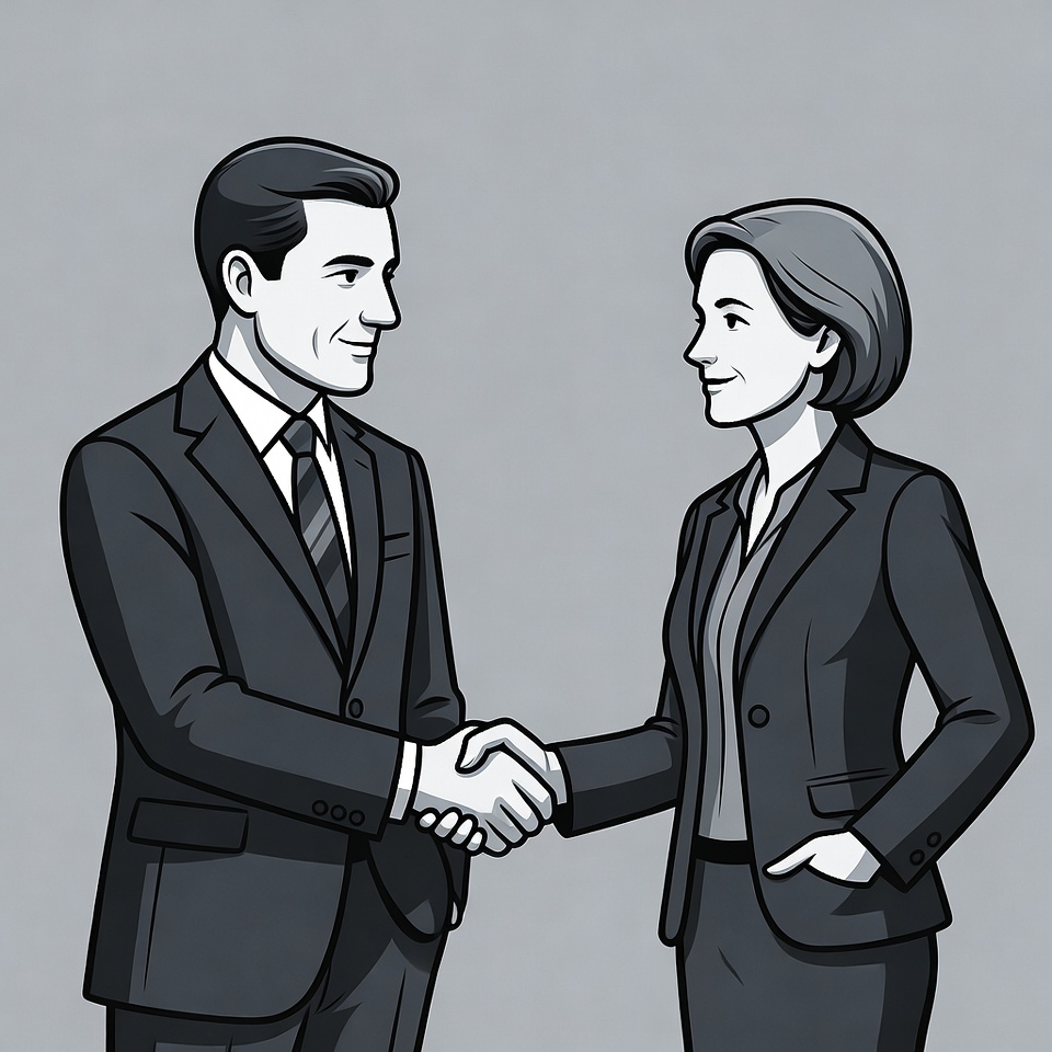 A black and white line art illustration depicts a man and woman in business suits shaking hands. The man wears a suit with a tie, and the woman wears a blazer with her hand in her pocket. They stand facing each other on a plain gray background.