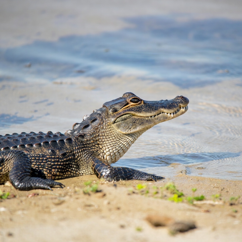animal, beast, crocodile, dangerous, green plants, lagoon, marsh, muddy water, nature, outdoors, predator, reptile, riverbank, rocks, sandy beach, scales, shore, swamp, teeth, water, wild, wildlife, yellow eyes, alligator