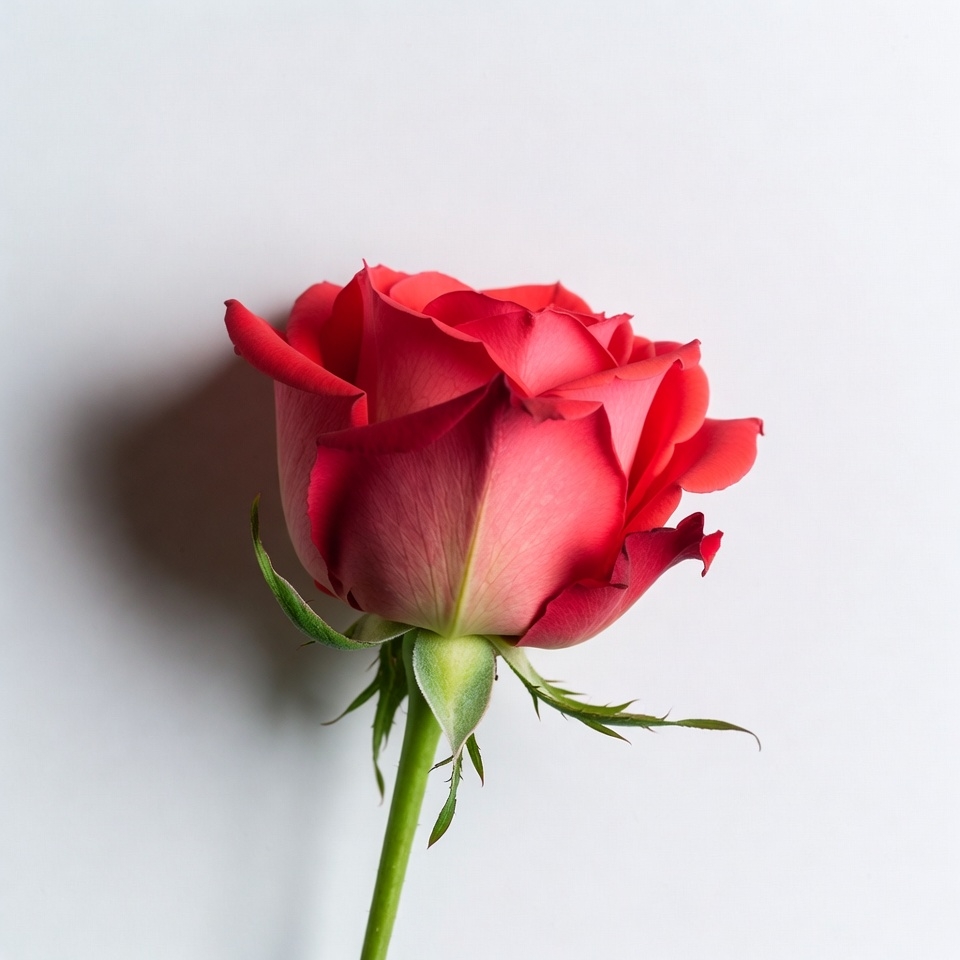 A vibrant red rose with layered petals stands upright against a plain white background. The flower features a green stem and sepals at its base. The petals display shades of deep red and pink near the center.