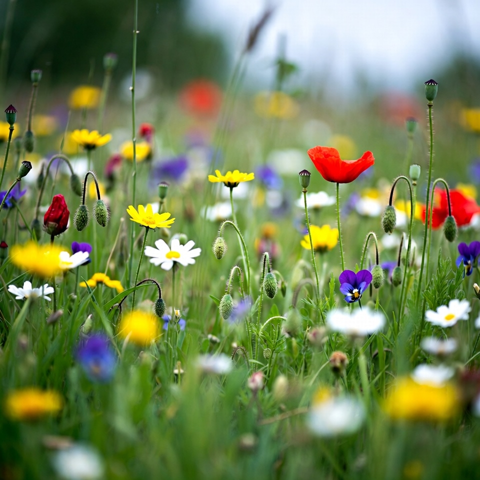 bloom, bokeh, closeup, colorful, daisies, field, flora, garden, green grass, macro, meadow, natural light, nature, outdoor, pansies, petals, poppies, purple flowers, red flowers, stems, summer, vibrant, white flowers, yellow flowers, wildflowers