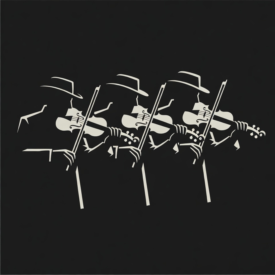 Three silhouetted male figures in fedora hats play violins on a black background. Each holds a violin under their chin with bows drawn across the strings. The illustration features clean white outlines against the dark backdrop.