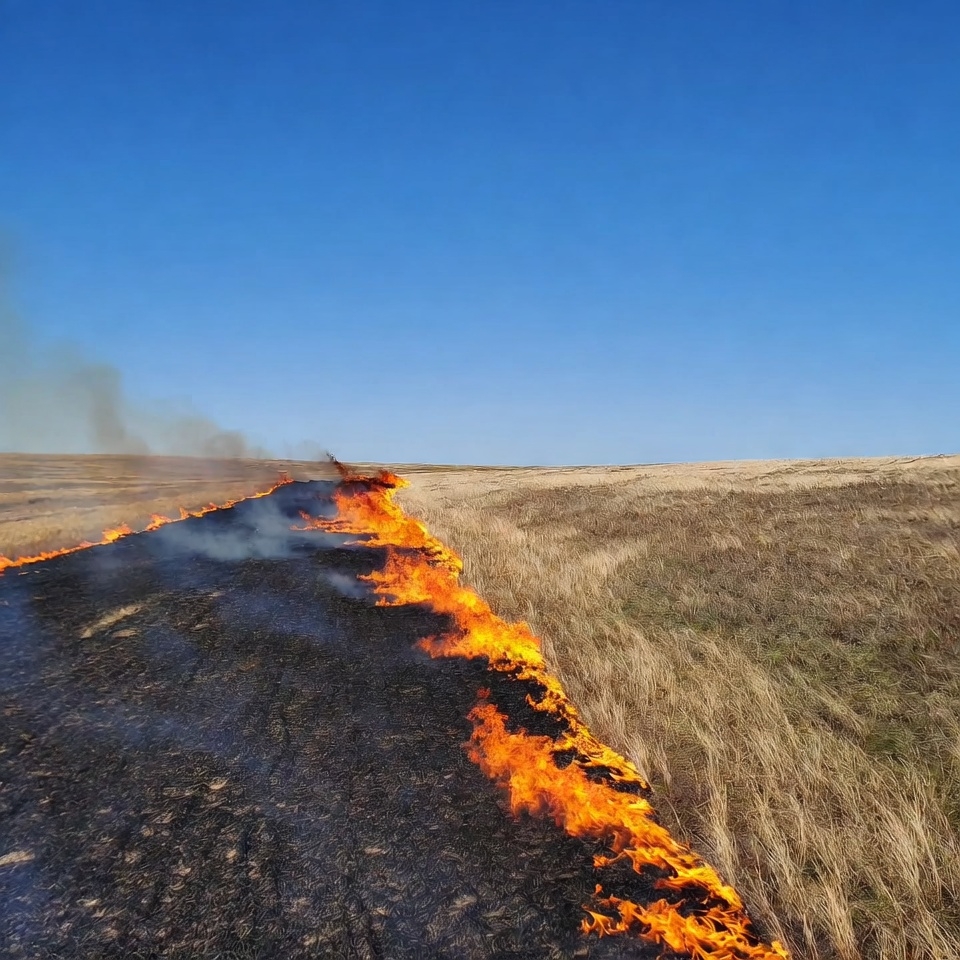 agriculture, blue sky, burning field, burning grass, charred ground, controlled burn, dry field, dry grass, field fire, fire line, flames, golden grass, grassland, intense flames, landscape, nature, open field, outdoors, prairie fire, rural, smoke, smoke plume, wildfire, grass fire