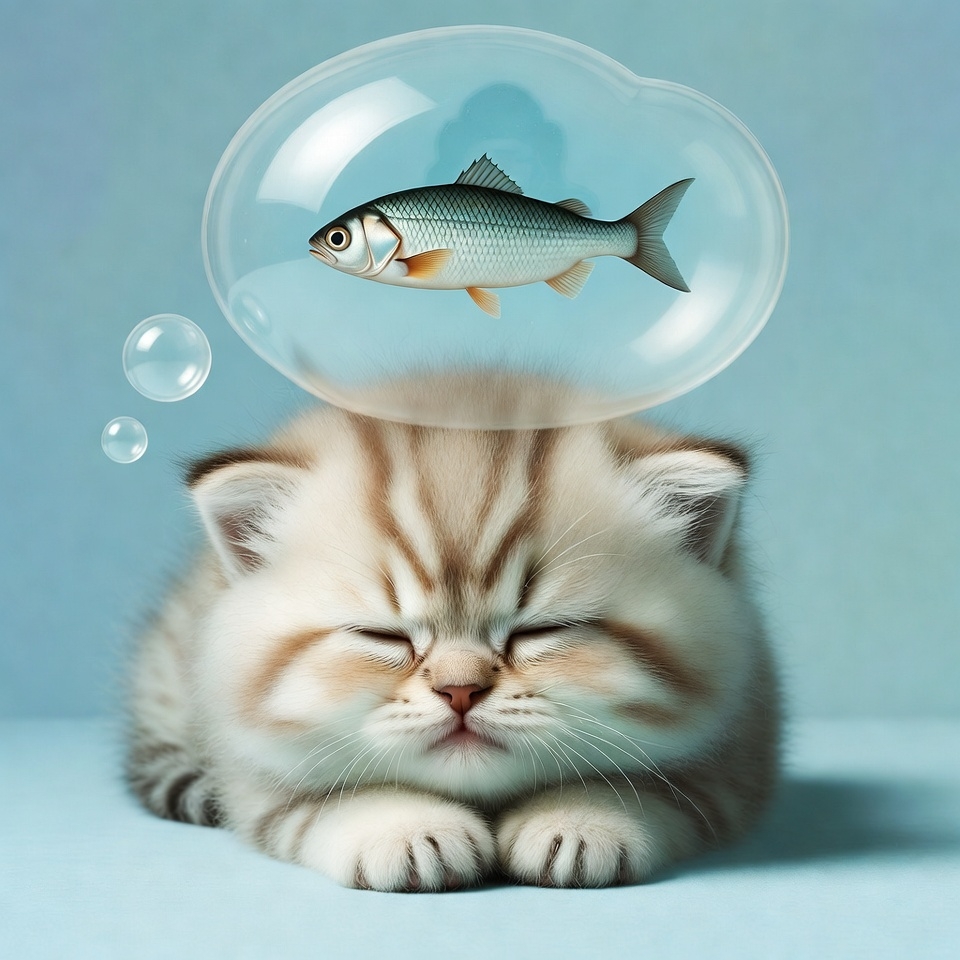 Sleeping Kitten Dreaming Fish Bubble