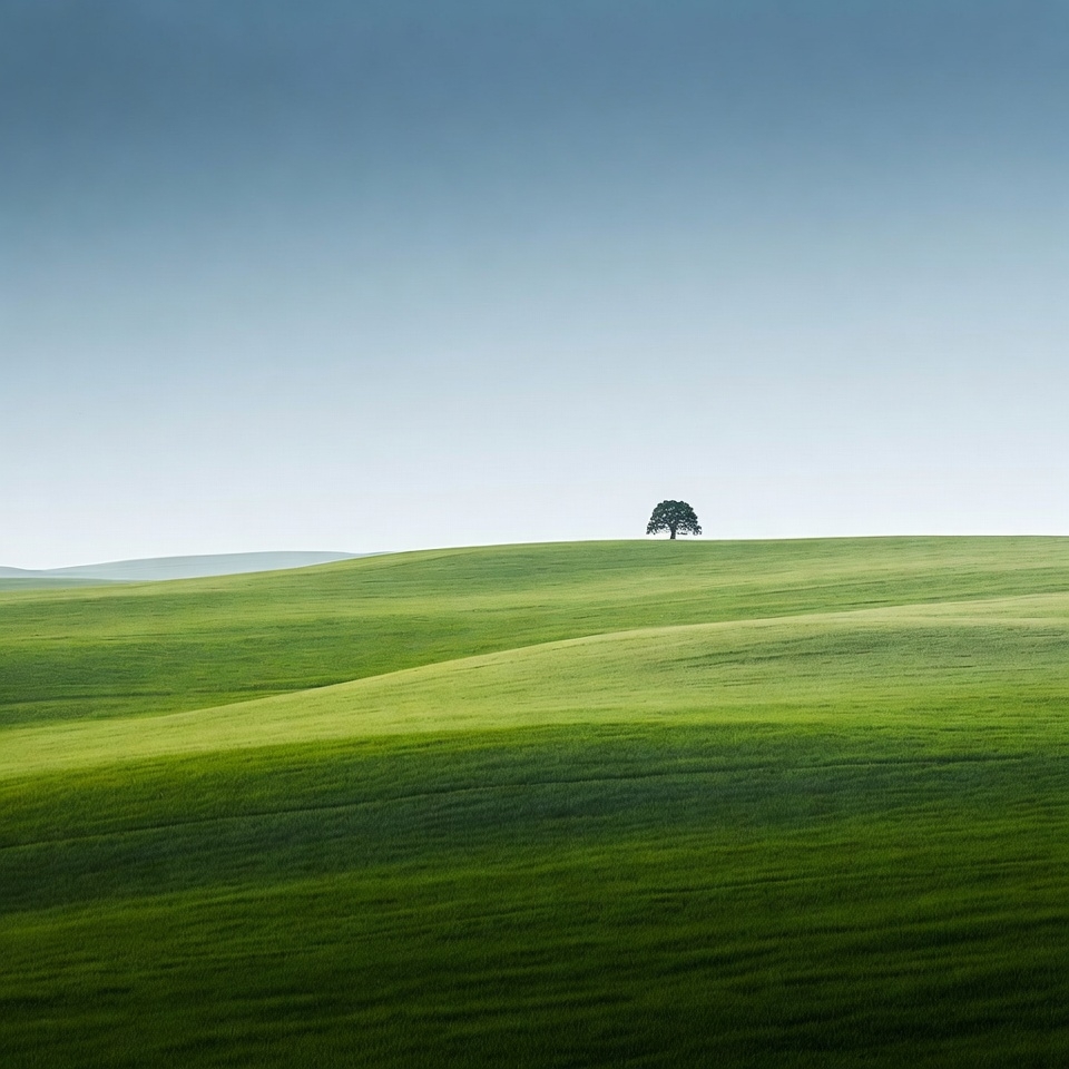 A single tree stands alone on a vast expanse of rolling green hills under a clear blue sky. The landscape features gentle, undulating fields of vibrant grass stretching to the horizon. The scene is serene with no other elements present.