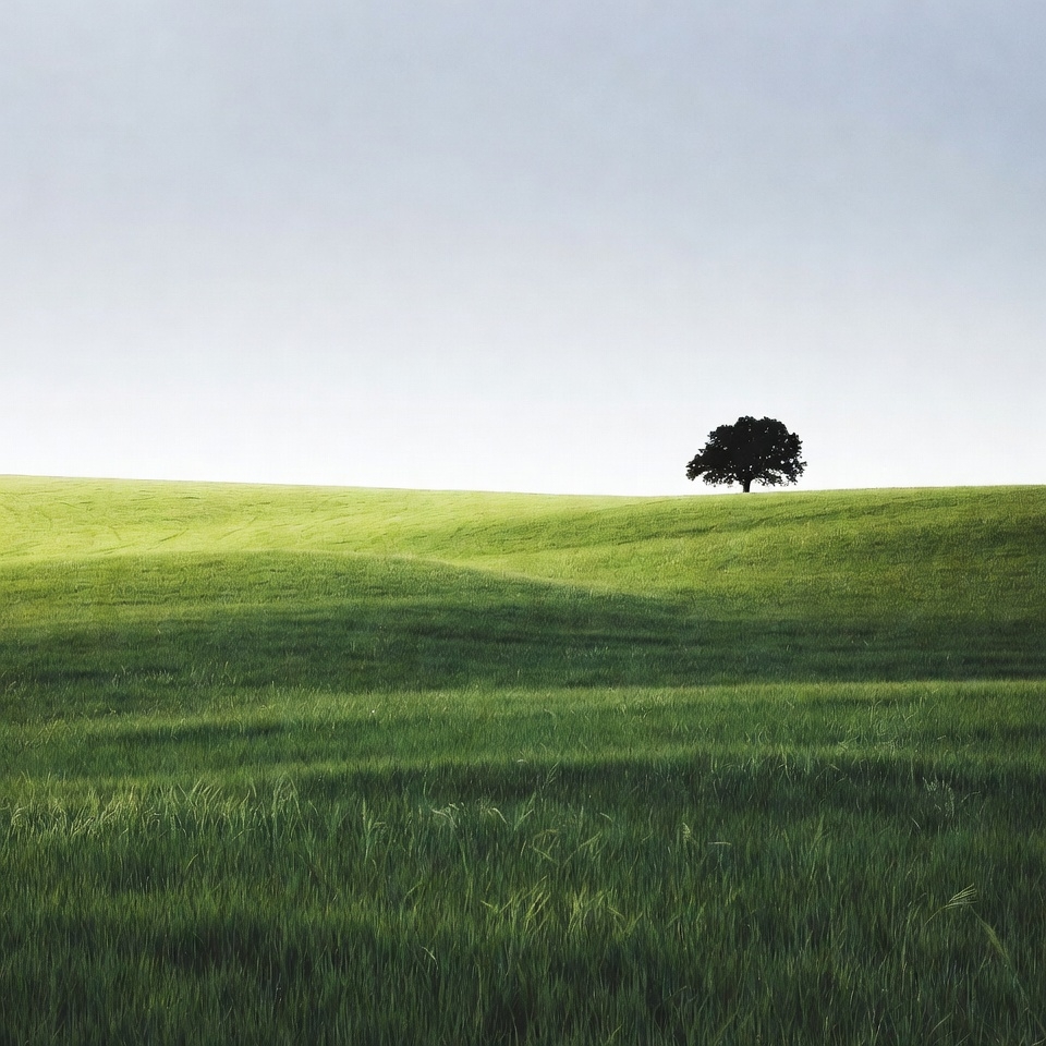 A single oak tree stands alone on a vast expanse of rolling green hills under a clear sky. The grass is lush and vibrant, with gentle undulations across the landscape. The scene features a minimalist composition with the tree centered against the horizon.