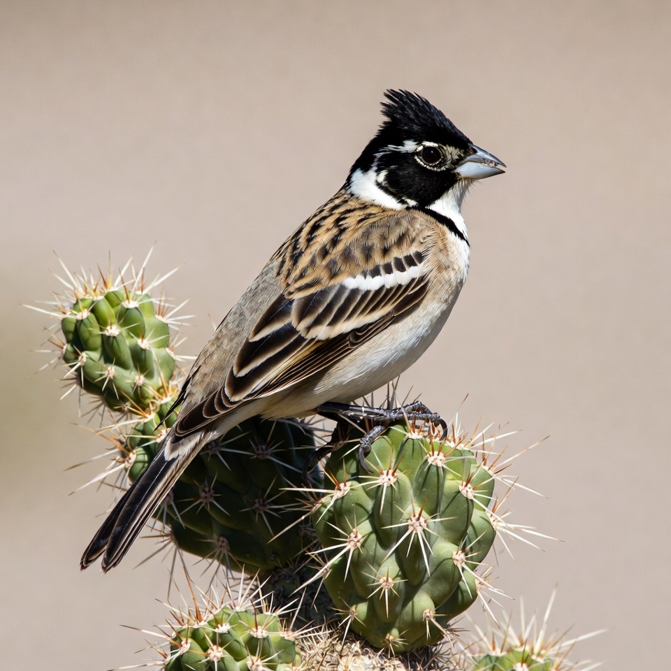 avian, beak, bird, birdwatching, black crest, black eye stripe, cactus, crested bird, desert bird, feathers, green cactus, isolated background, nature, perched bird, prickly pear, sparrow-like, spines, streaked wings, white face, wildlife, wildlife photography, Lark Bunting