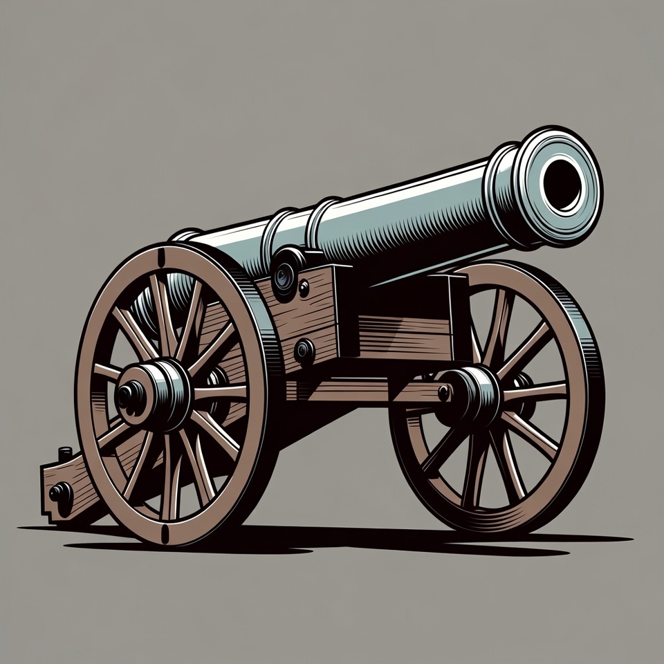 artillery, clipart, drawing, grayscale, gun barrel, historical cannon, illustration, isolated background, line art, military weapon, vector art, vintage cannon, wooden wheels, cannon