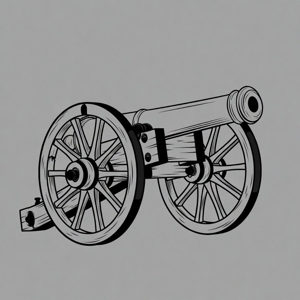 artillery, barrel, clipart, drawing, historical cannon, illustration, isolated background, line art, military weapon, old cannon, sketch, vector art, vintage cannon, wooden wheels, cannon