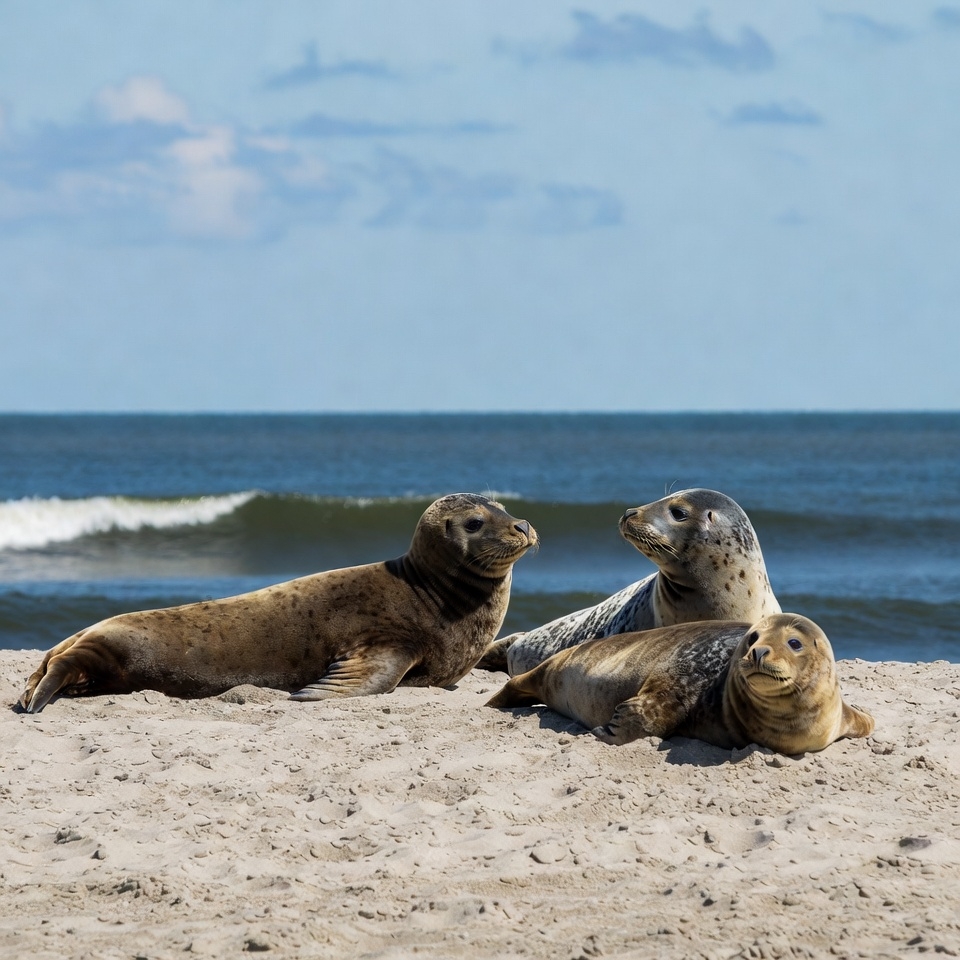 Three harbor seals with spotted gray fur are lying relaxed on a sandy beach near the ocean. Gentle waves crash in the background under a partly cloudy blue sky. The seals face the sea, basking in the sunlight.