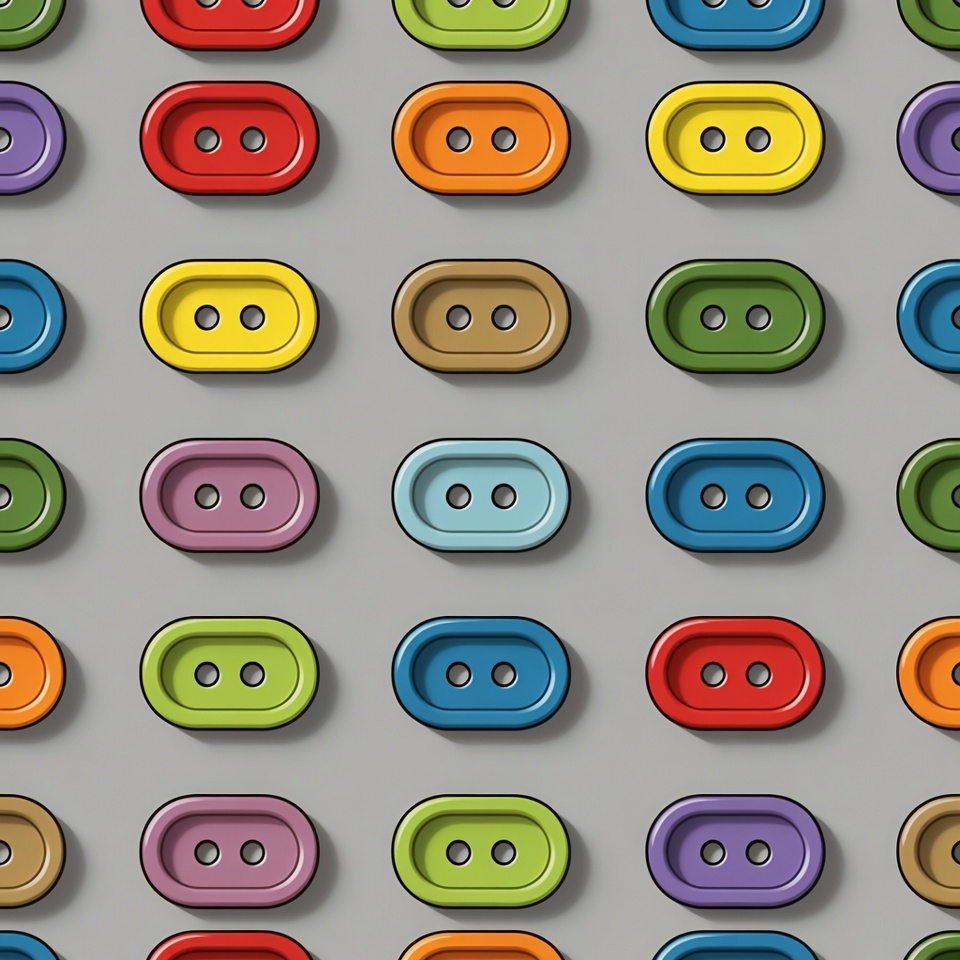 A seamless pattern features numerous colorful buttons arranged in a grid on a gray background. Each button has two holes and comes in vibrant shades like red, blue, green, yellow, purple, orange, and brown. The buttons have a glossy, three-dimensional appearance.