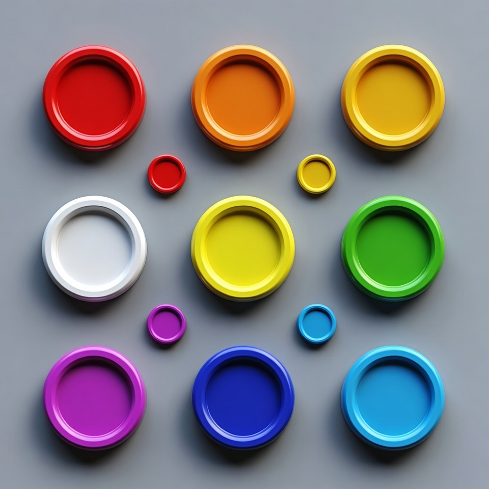 A collection of colorful 3D rendered plastic discs in red, orange, yellow, green, blue, purple, cyan, and white is arranged on a gray background. The discs vary in size, with larger ones prominently displayed and smaller ones interspersed among them. They feature glossy surfaces and circular shapes with raised edges.