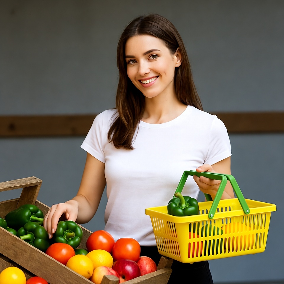 A smiling woman with long brown hair stands next to wooden crates of fresh vegetables including green bell peppers, tomatoes, and oranges. She wears a white t-shirt and black leggings while holding a yellow plastic basket filled with green peppers. The setting appears to be an outdoor market with a gray background.