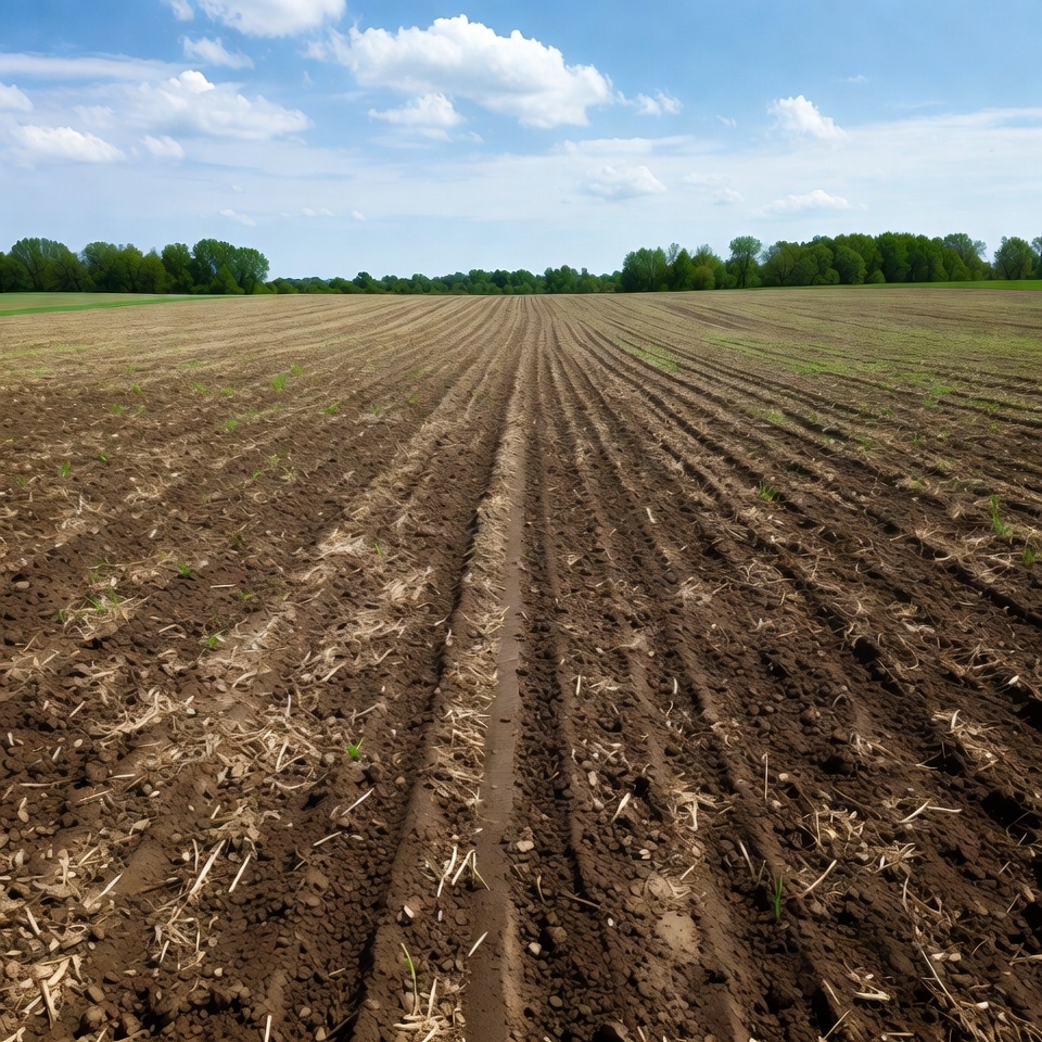 A vast field with straight rows of dark soil and emerging green sprouts stretches to the horizon. Lush green trees line the edges under a bright blue sky with scattered white clouds. The landscape shows fresh tillage in a rural agricultural setting.