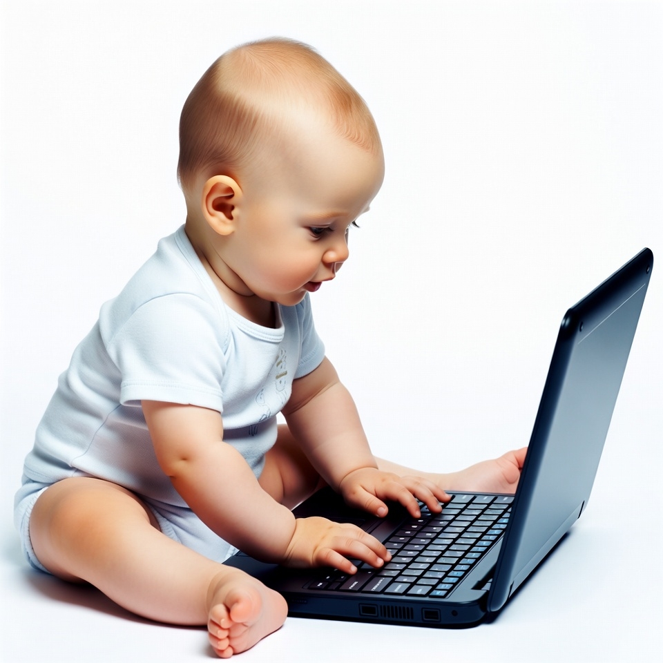 adorable infant, baby tech, bare feet, child, computer, cute baby, focused baby, infant, isolated, keyboard, laptop, light hair, sitting baby, typing, using laptop, white background, white onesie, baby