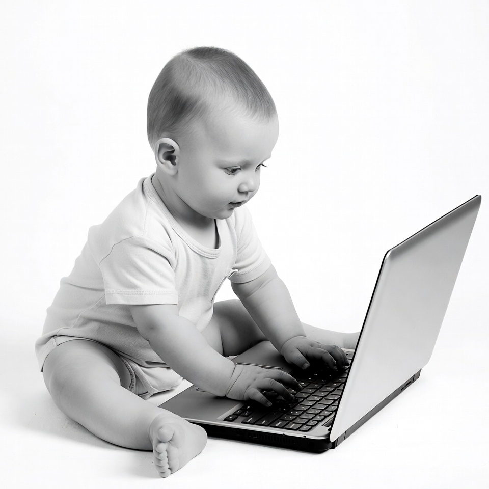 A baby with light hair sits on a white background, typing on an open silver laptop. The infant wears a light-colored onesie and looks at the screen with wide eyes and an open mouth. The black and white photo captures the baby sitting with legs extended, hands on the keyboard.