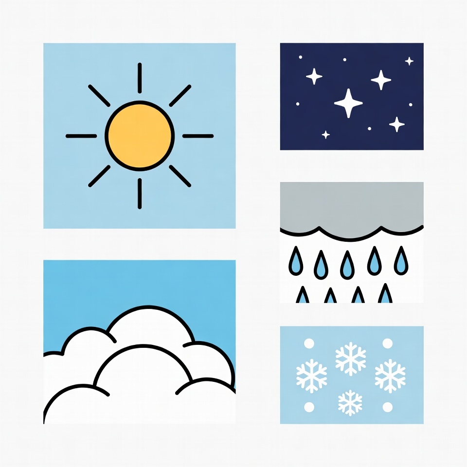 Four Weather Icons: Sun, Stars, Cloud, Rain, Snow