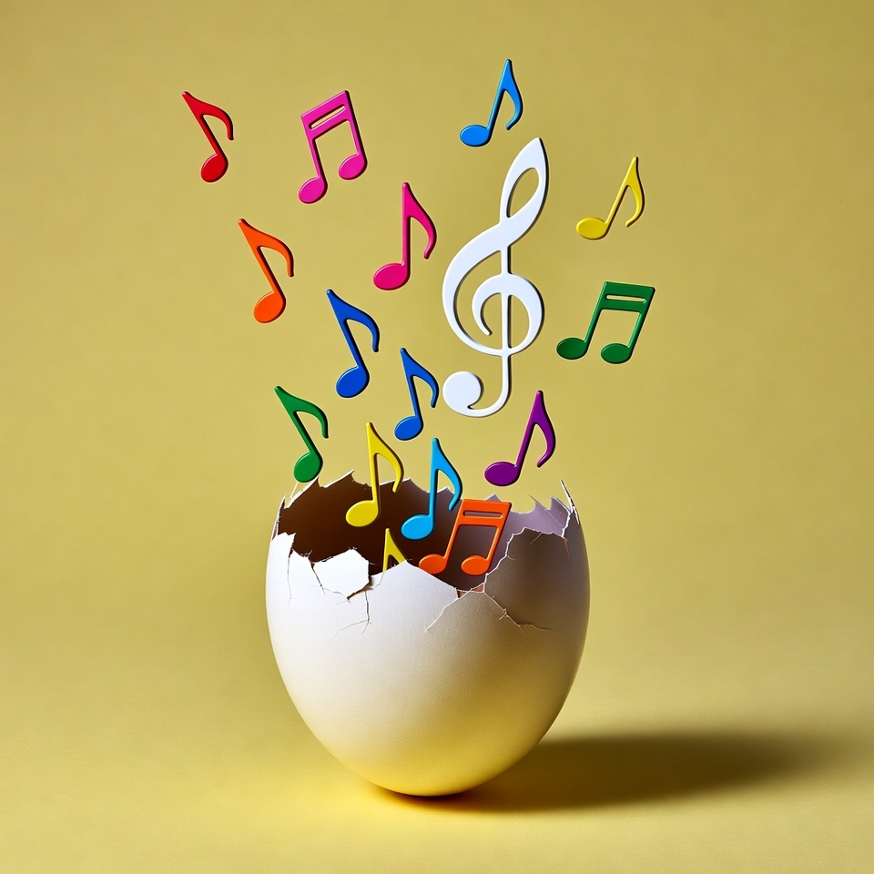 A large white egg with a cracked top sits on a yellow background. Vibrant red, blue, pink, and other colored musical notes and treble clefs burst upward from the opening. The notes appear to be paper cutouts floating dynamically.