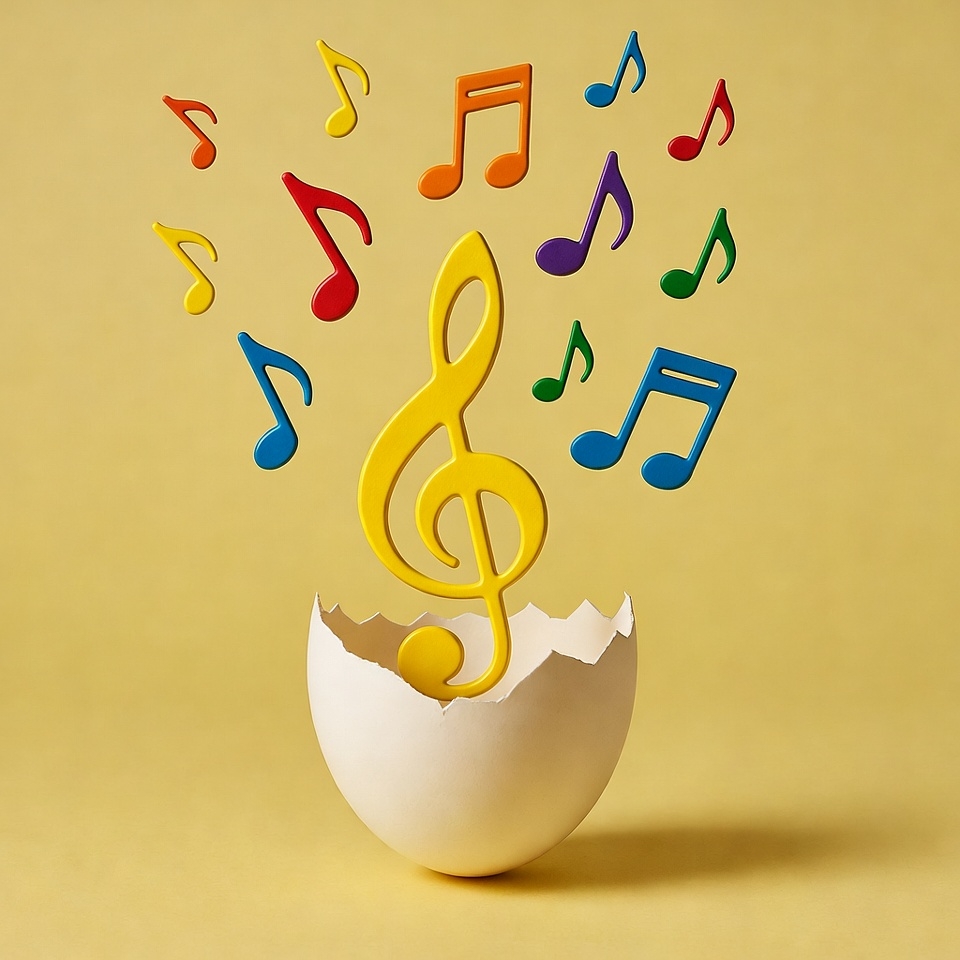 A golden treble clef emerges from a cracked white egg on a yellow background. Colorful musical notes in red, blue, green, orange, and purple float around it. The scene features a 3D illustration style with vibrant colors.