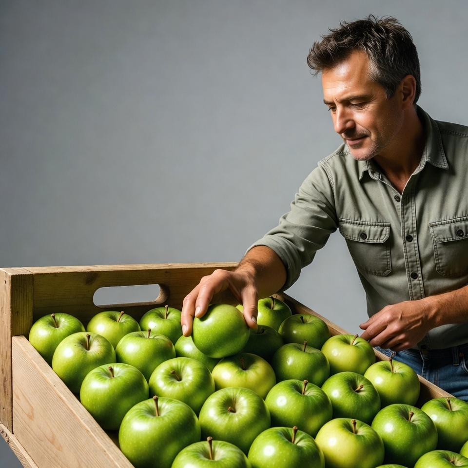 A middle-aged man with short dark hair leans over a wooden crate filled with fresh green apples. He wears a green button-up shirt and jeans, holding one apple in his hand while inspecting it closely. The background is plain gray, highlighting the apples and the man.