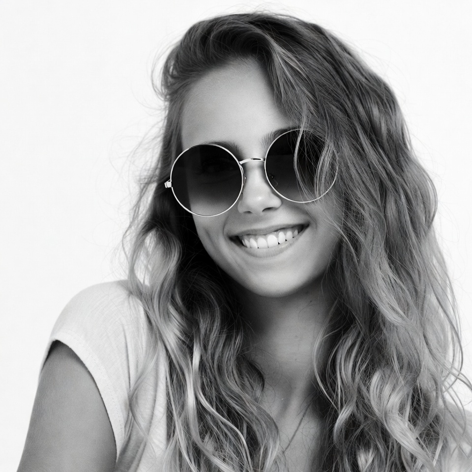 A young woman with long wavy hair smiles at the camera while wearing oversized round sunglasses. She has a white sleeveless top and poses against a plain white background. The image is in black and white.