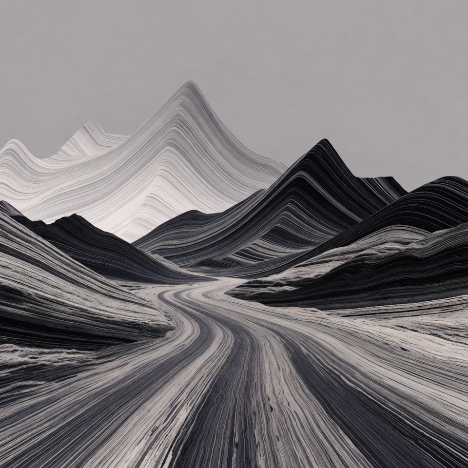 abstract art, artistic mountains, black white, curved path, digital art, foggy mountains, grayscale, illustration, layered mountains, line art, minimalist art, mountain range, nature art, peaks, rippled contours, scenic view, surreal landscape, valley, winding road, mountains