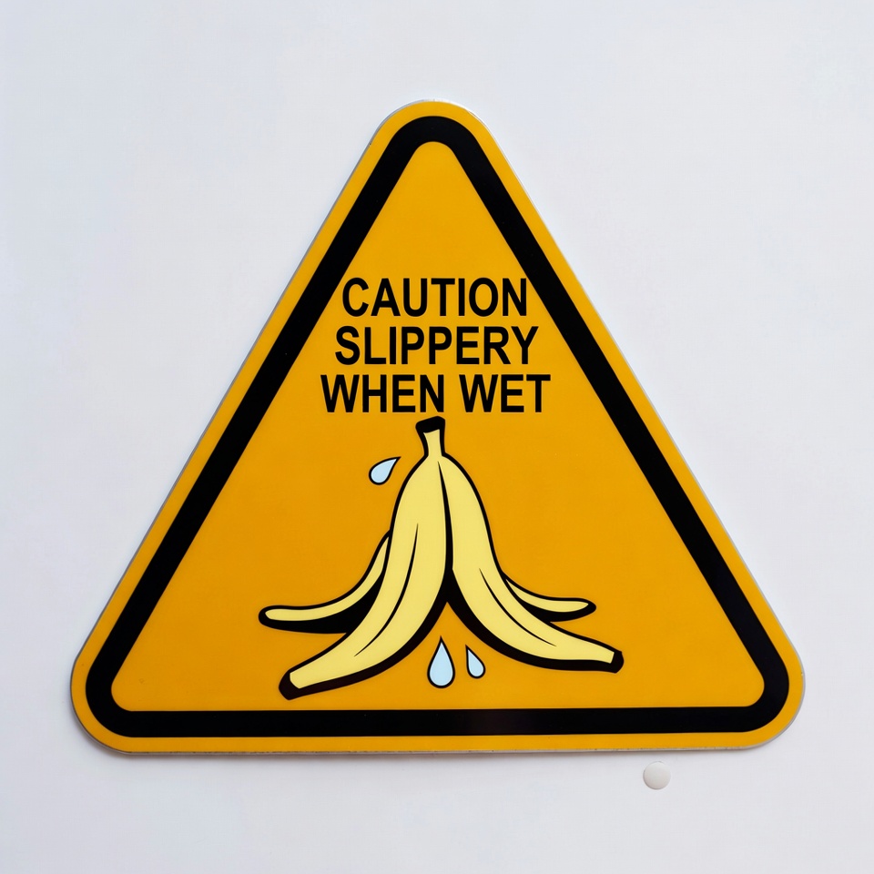 banana peel, black border, cartoon banana, caution sign, clipart, floor hazard, hazard sign, illustration, isolated background, safety sign, slippery when wet, water droplets, wet floor, yellow triangle, warning sign