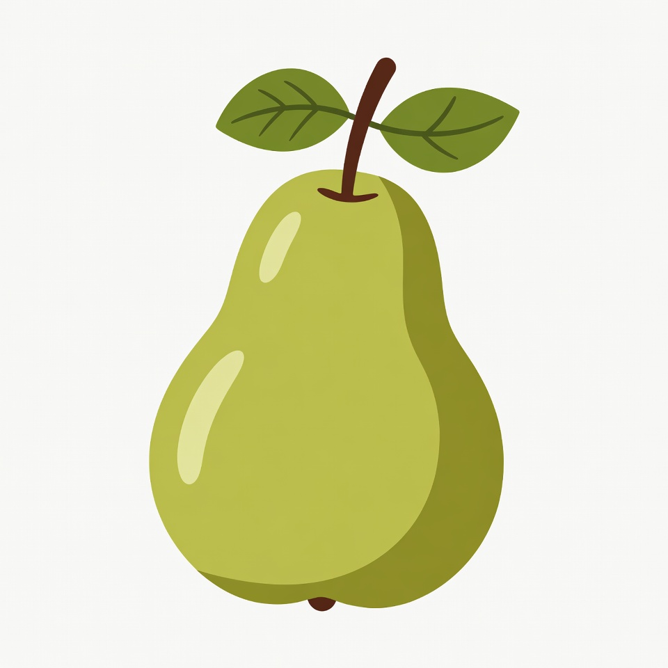 A vibrant green pear illustration features a glossy surface and a short brown stem. Fresh green leaves extend from the top of the stem. The cartoon-style fruit is isolated on a white background.