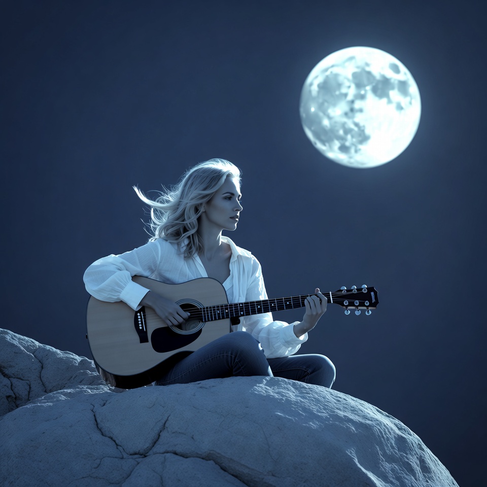 A blonde woman with flowing hair sits on a rock playing an acoustic guitar at night. A large full moon glows brightly in the dark blue sky behind her. She wears a white shirt and jeans in this serene outdoor scene.