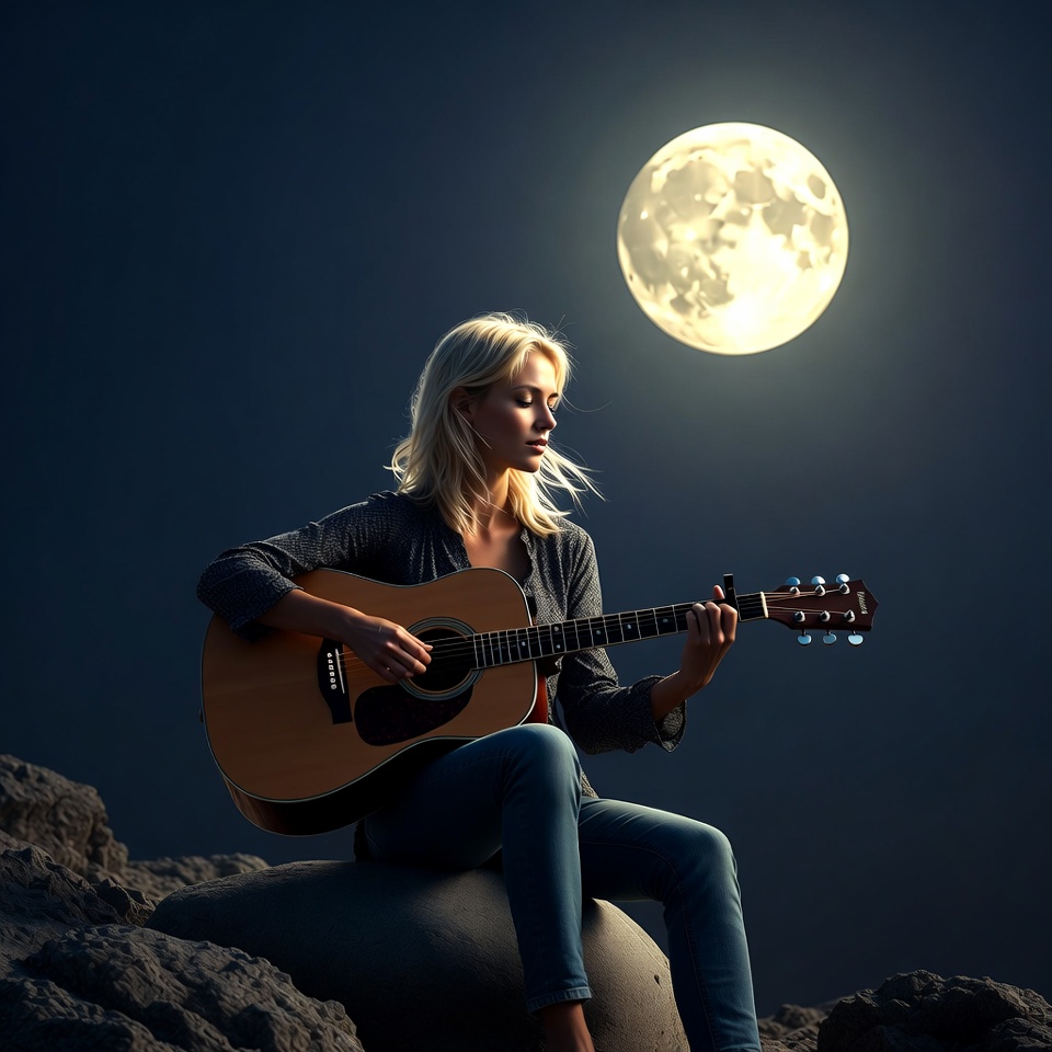 A blonde woman with long hair sits on a rock playing an acoustic guitar at night. She wears a gray cardigan and blue jeans, with a large full moon illuminating the dark sky behind her. Her fingers are positioned on the guitar strings as she strums.