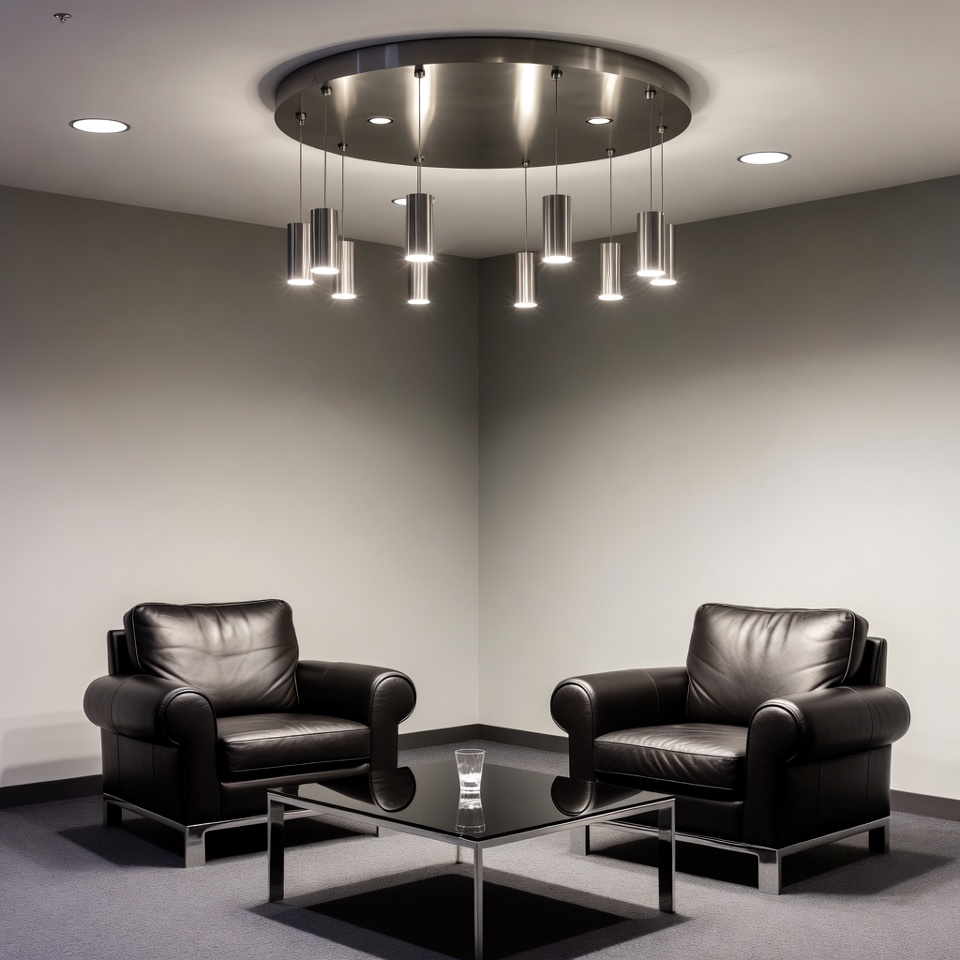 armchairs, black chairs, business lounge, chandelier, contemporary decor, dark floor, glass table, gray walls, hanging lamps, illuminated corner, interior design, lounge seating, luxury seating, metallic lighting, minimalist room, modern furniture, office corner, office seating, pendant lights, reception furniture, sleek design, square table, stylish furniture, waiting area, water glass, leather chairs