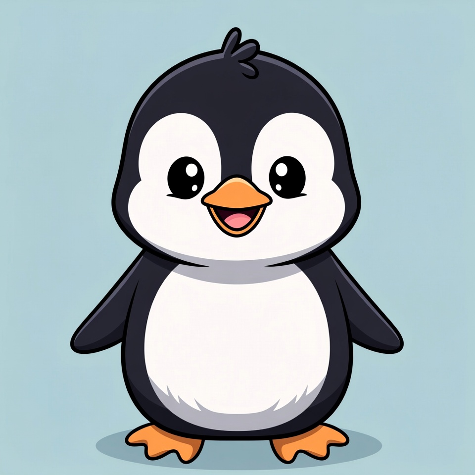 A chibi-style cartoon penguin with black and white feathers stands on a light blue background. It has large sparkling eyes, a happy smile, and orange beak and feet. The illustration features bold outlines and a playful, isolated design.