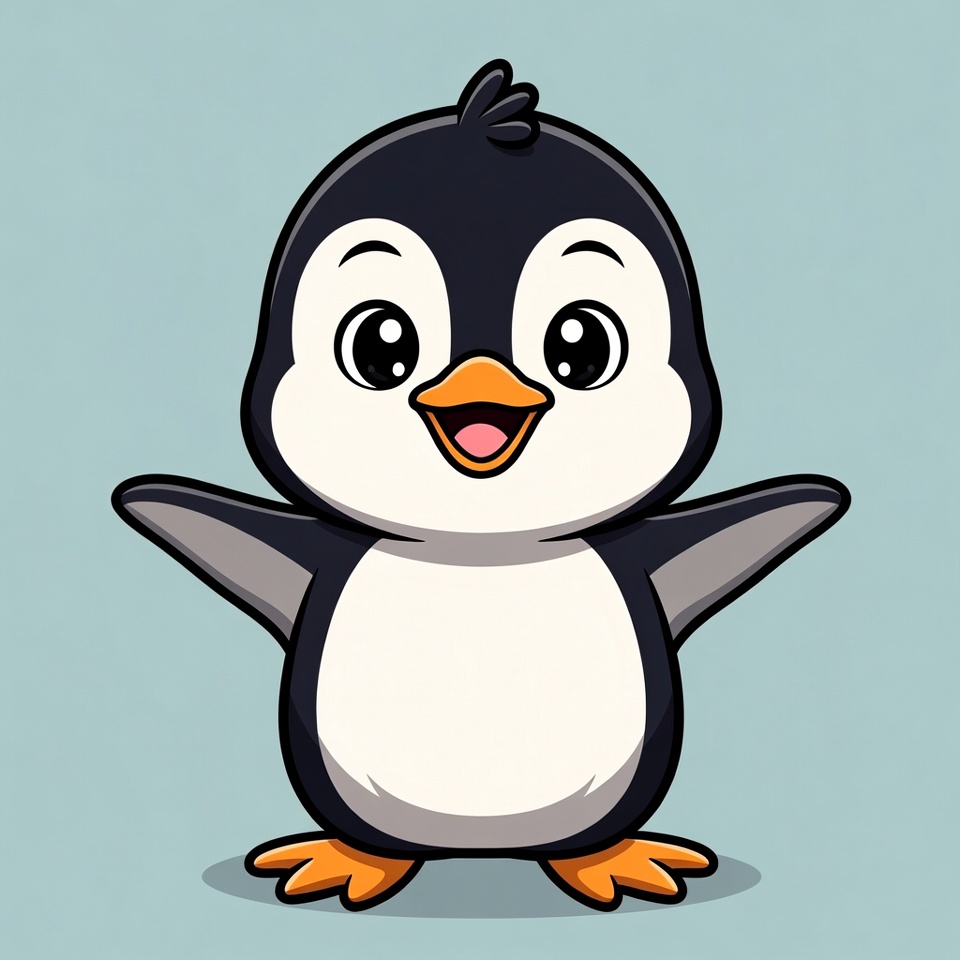 A cute cartoon penguin with big sparkling eyes and a happy smile stands on a light blue background. It has black feathers on its head and back, white belly, and orange beak and feet. The penguin spreads its flippers wide in a cheerful pose.