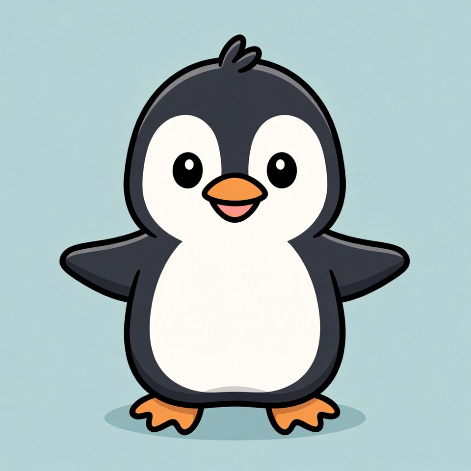 A kawaii-style cartoon penguin with black and white feathers stands on a light blue background. It has large sparkling eyes, a small orange beak, and orange feet. The penguin spreads its flippers wide with a happy smile.