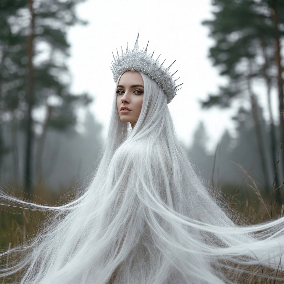 A woman with long flowing white hair wears an ornate silver crown and stands in a misty forest surrounded by pine trees. She has a serene expression and gazes directly at the viewer. Tall grasses and fog add to the ethereal forest backdrop.