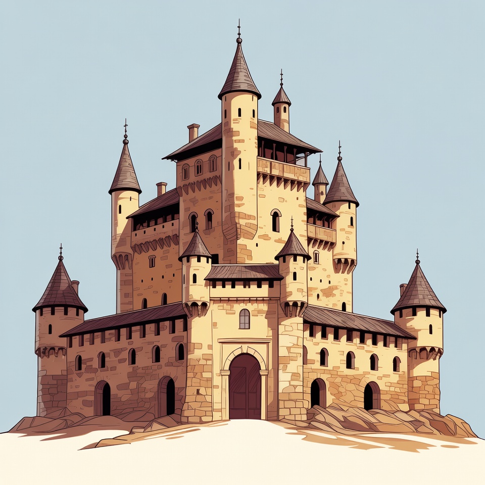 A detailed illustration of a tall medieval castle with multiple towers and spires on a rocky base. The castle features stone walls, arched windows, a large wooden entrance gate, and reddish-brown roofs against a light blue sky. It is rendered in a clean line art style with tan and brown tones on an isolated white background.