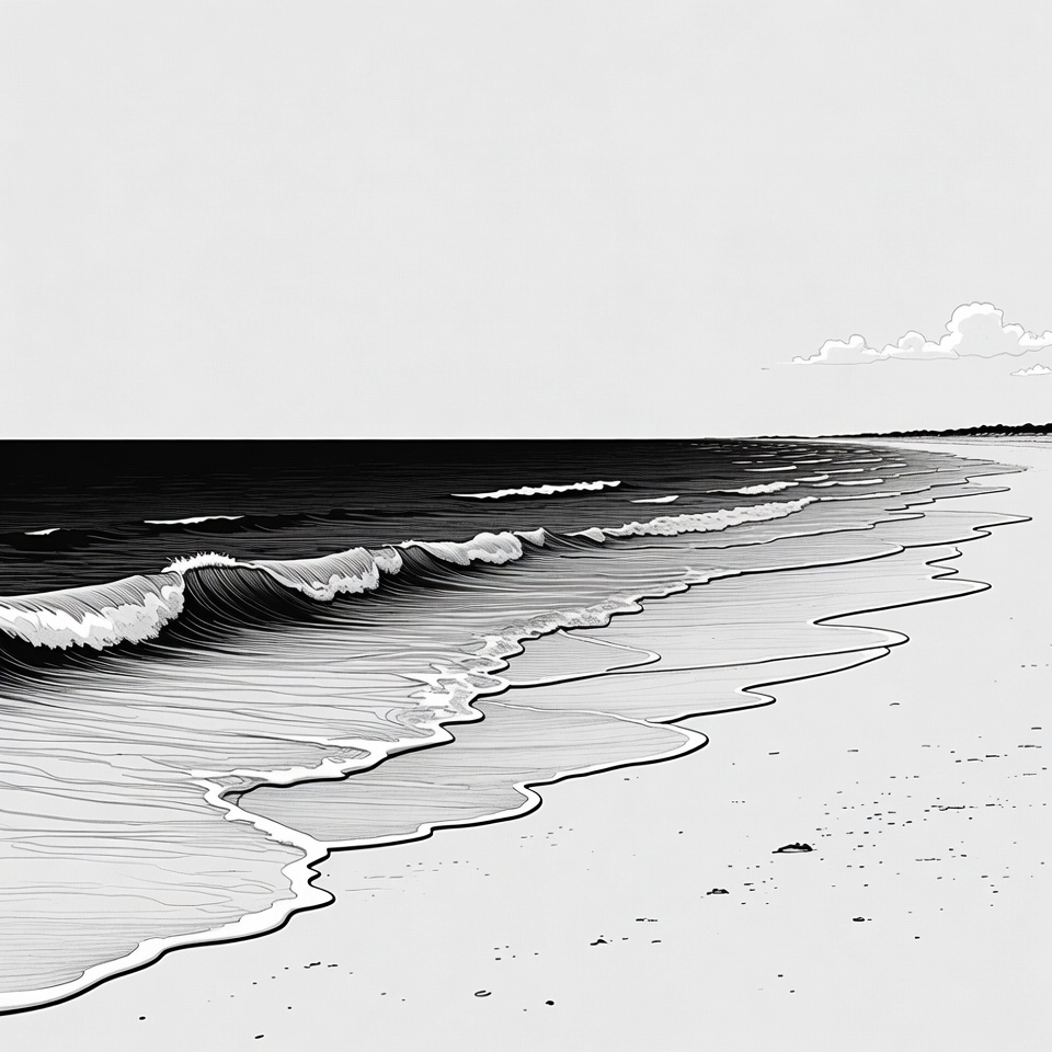 A black and white illustration depicts ocean waves crashing onto a sandy beach. The waves curve dynamically with white foam, extending across the horizon under a cloudy sky. The scene features a serene shoreline with subtle sand textures.