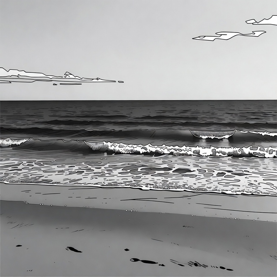 A black and white sketch depicts a sandy beach with gentle waves from the ocean rolling onto the shore. Footprints are visible in the wet sand near the water's edge. Scattered clouds appear in the sky above the seascape.