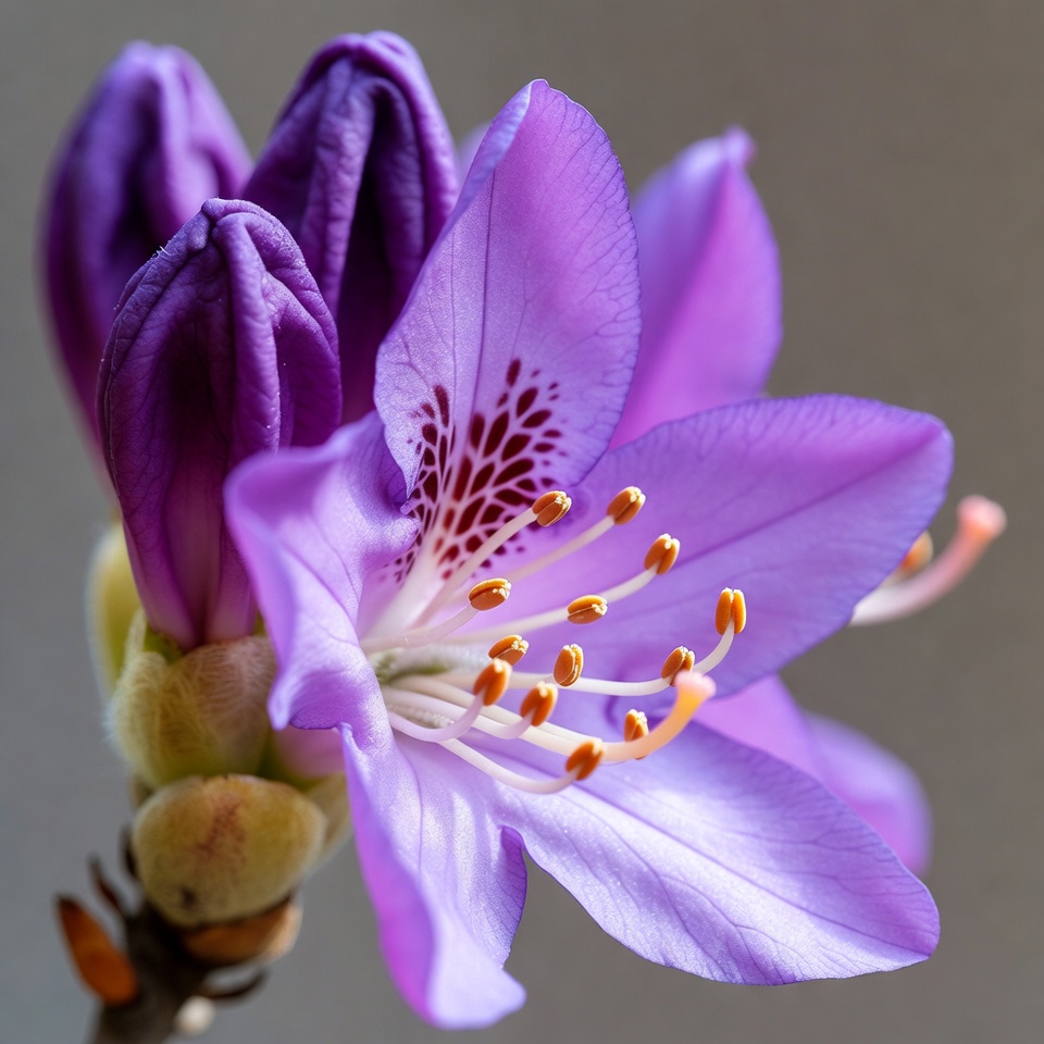 bloom, blossom, buds, closeup, floral, flower, green stem, isolated background, macro, nature, orange stamen, petals, plant, purple, stamen, veined petals, vibrant, purple flower
