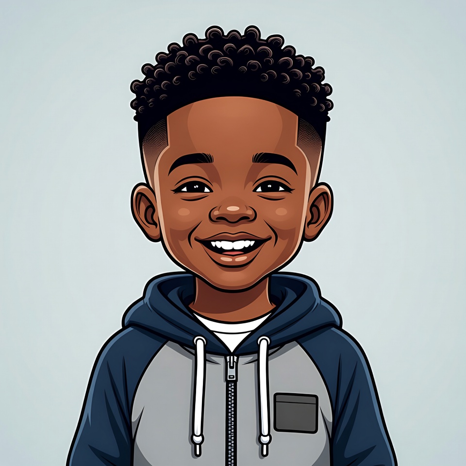 A cartoon illustration of a young African-American boy with curly hair smiles happily at the viewer. He wears a blue and gray zip-up hoodie with white drawstrings. The boy is centered on a plain light blue background.