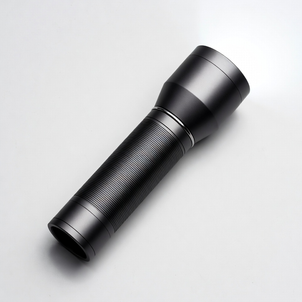 LED flashlight, battery light, black flashlight, emergency light, flashlight head, grip handle, handheld light, isolated background, metal flashlight, portable light, tool, torch, white background, flashlight